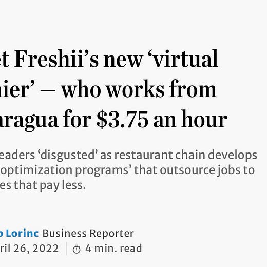 Occasionally chatbots are introduced in a customer service context as a labour-saving tactic that mimics a real-life worker and triages needs. The program recently introduced at Freshii franchises is a virtual cashier that substitutes a live, in-person interaction with a live, digital interaction with a worker that is in Nicaragua.